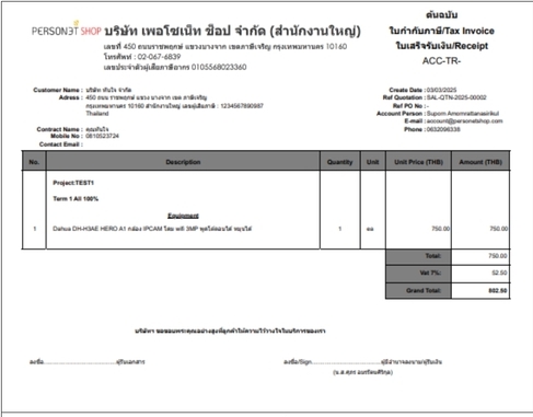 หลังจากตรวจสอบความถูกต้องของข้อมูลทั้งหมดแล้ว สามารถเลือกพิมพ์ใบแจ้งหนี้ออกมาเป็นเอกสารหรือบันทึกเป็นไฟล์ PDF เพื่อนำส่งให้ลูกค้าผ่านอีเมลหรือช่องทางอื่นๆ ได้อย่างง่ายดาย และหลังจากยืนยันการชำระเงินจากลูกค้าแล้ว ท่านสามารถกลับมาที่หน้าเดิมนี้ได้ใน Dashboard แล้วเลือกพิมพ์ใบกำกับภาษีออกมาจากเมนูฟอร์มที่มีให้เลือกเพื่อบันทึกการชำระเงินในระบบต่อไป